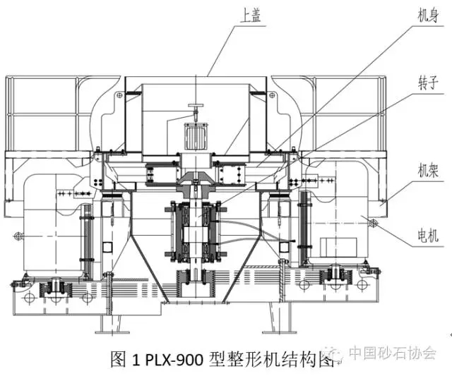 立軸沖擊制砂機(jī)機(jī)主要由上蓋、機(jī)身、機(jī)架、轉(zhuǎn)子、電機(jī)及傳動幾部分組成。結(jié)構(gòu)如圖1所示。