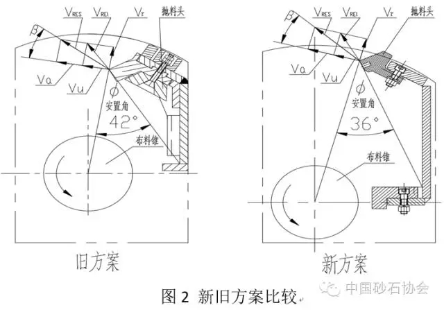 在轉(zhuǎn)速、葉輪直徑、布料錐大小不變的前提下,著眼于盡可能增大拋射點的半徑Ra,適當(dāng)調(diào)整導(dǎo)料安置角φ,提出了改進(jìn)方案。新舊方案拋料頭的布置見圖2。