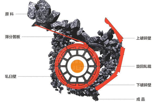 粗碎旋回破碎機主要由進料斗總成、上破碎壁、下破碎壁、傳動總成、旋回軋輥、篩分篦板、防護罩、機架、液壓調(diào)整及過載保護裝置組成。