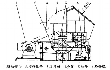 在單段錘式破碎機運行過程中,大塊石頭物料進入破碎腔內,堆放在機器內特設的中間托架上,由在托架間隙中運行的破碎機錘頭擊碎而墜落,再經(jīng)高速運轉的錘頭進一步打擊而細碎,符合尺寸規(guī)格的石料, 后經(jīng)篦板均整合格后排出。