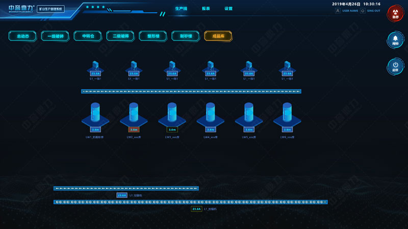 DCS系統(tǒng)可可設(shè)置半成品料庫、中碎篩分料倉、成品料庫料位高度上上限、上限和下限值,并有停機(jī)及報(bào)警提醒。