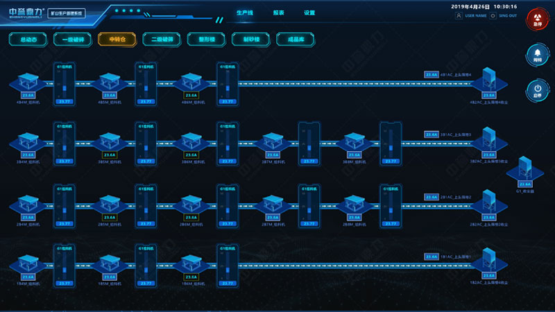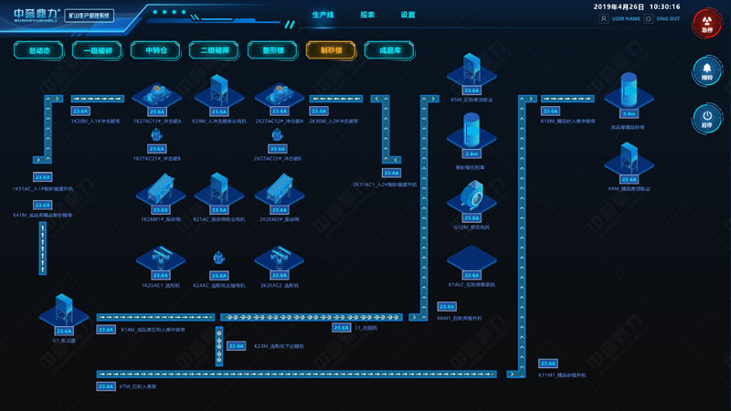 礦山生產(chǎn)管理系統(tǒng)三維形式展現(xiàn)整個(gè)生產(chǎn)線,可遠(yuǎn)程控制砂石骨料線的給料機(jī)、破碎機(jī)、皮帶機(jī)、制砂機(jī)、振動(dòng)篩等各設(shè)備的啟停,通過傳感裝置感知設(shè)備運(yùn)行狀態(tài)(如設(shè)備溫度、電壓、電流、振頻等數(shù)據(jù)),可監(jiān)測生產(chǎn)線產(chǎn)量、各儲(chǔ)料倉料位高度等信息,自動(dòng)生成報(bào)表,實(shí)現(xiàn)礦山生產(chǎn)環(huán)節(jié)的智能化操控管理及生產(chǎn)決策。
