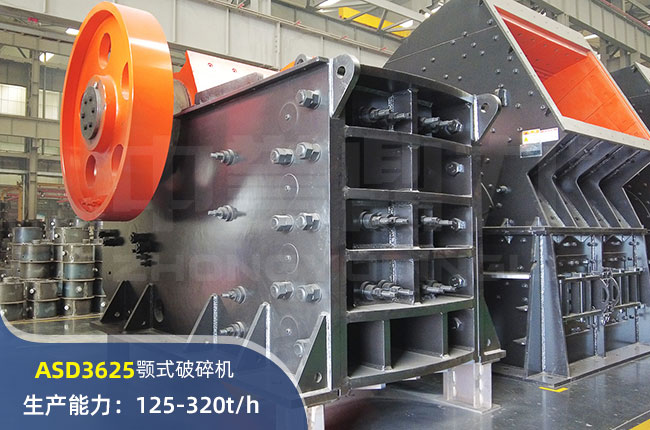ASD3625顎式破碎機進料粒度425mm,出料粒度50mm,產(chǎn)量在125-320噸左右,屬于中小型顎式破碎機。
