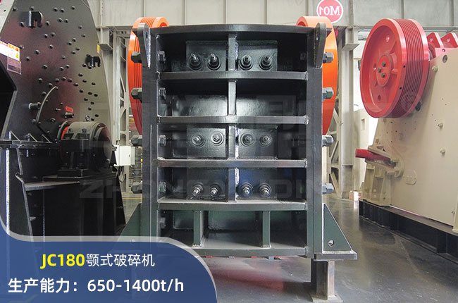 JC180顎式破碎機進料口尺寸1800×1500mm,進料粒度≤1280mm,出料大小≤175mm,電機功率355kw,時產量在1400噸。