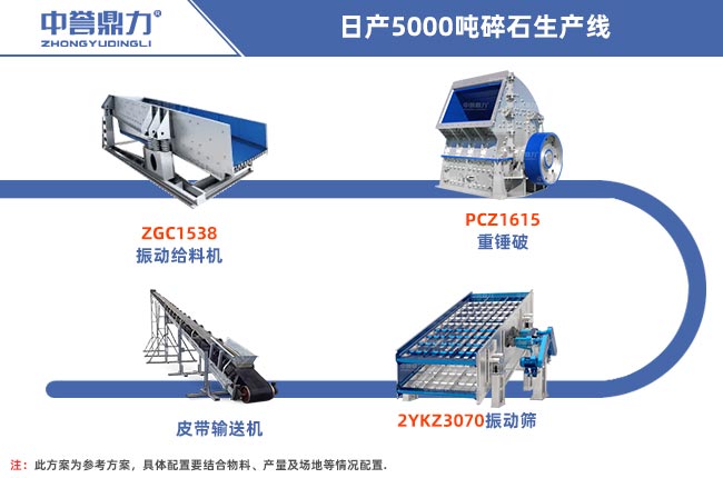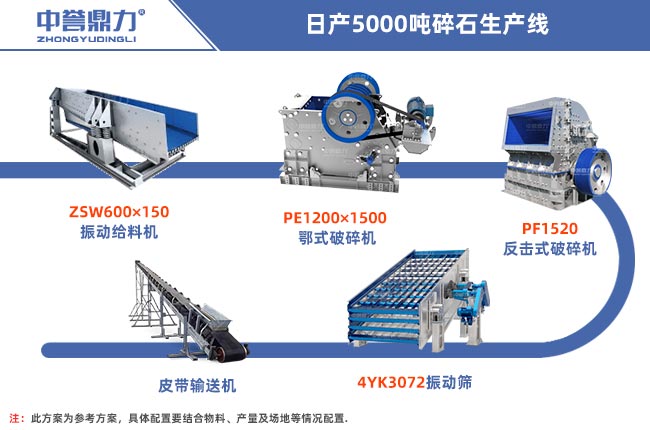 日產(chǎn)5000噸的生產(chǎn)線,時產(chǎn)量在620噸左右,其配置方案有好多種,設(shè)備配置比較靈活不固定,可以根據(jù)加工需求進(jìn)行合理的選擇,常見的配置方案有鄂破+反擊破,還有單獨一臺重錘破的配置,具體詳情如下: