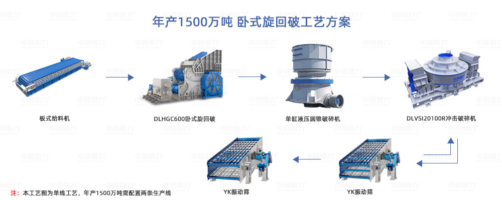 臥式旋回破相比傳統(tǒng)旋回破建設(shè)高度低,基礎(chǔ)建設(shè)上投資小,直接選用DLHGC600臥式旋回破同樣組建兩條生產(chǎn)線輕松滿足年產(chǎn)1500萬(wàn)噸的需求,二破的選用上建議采用單缸圓錐破,后加一天DLVSI20100R沖擊破即可生產(chǎn)05、12、13等規(guī)格骨料。