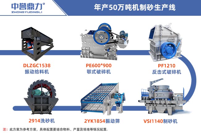 年產(chǎn)50萬(wàn)噸,采用PE600×900顎式破碎機(jī)+4臺(tái)PEX250×1000細(xì)碎鄂破+VSI7611沖擊式制砂機(jī)+配套設(shè)備方案,適用于鵝卵石等硬巖破碎,因投資預(yù)算不高,故中細(xì)碎設(shè)備采用細(xì)碎鄂破機(jī),如預(yù)算充足,可以直接采用一臺(tái)圓錐破碎機(jī)。