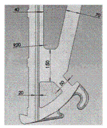 原始的機(jī)構(gòu)尺寸如下圖1,分別對(duì)額板處、額板背面,肘板銜接處、出料口出的尺寸進(jìn)行優(yōu)化,為肘板的安系數(shù),肘板銜接處的尺寸限尺寸定為:Xmin=50毫米,其它幾個(gè)尺寸分別根據(jù)邊界條件進(jìn)行優(yōu)化,通過6次迭代,取得優(yōu)化后的結(jié)構(gòu)尺寸如下圖2。