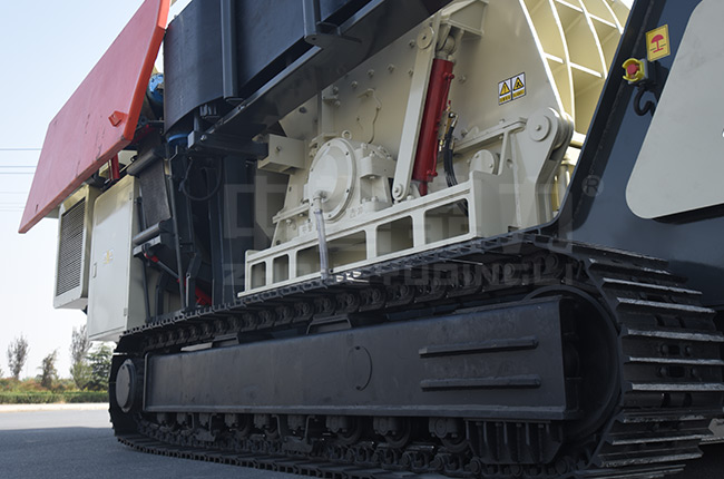 履帶式移動破石機:履帶底盤機架,會對路面造成損壞,不適合長距離運輸,但履帶抓地力強,可以爬坡,能適應各種復雜、惡劣的環(huán)境。可用于礦石、尾礦的破碎。