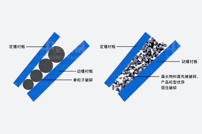 粒間層壓破碎,合理利用物料間的相互擠壓,在提升破碎效率、成品比例的同時(shí),較大程度上減少了傳統(tǒng)圓錐破針片狀含量大的問題,實(shí)現(xiàn)破碎粒度均勻、粒形、級(jí)配更合理。