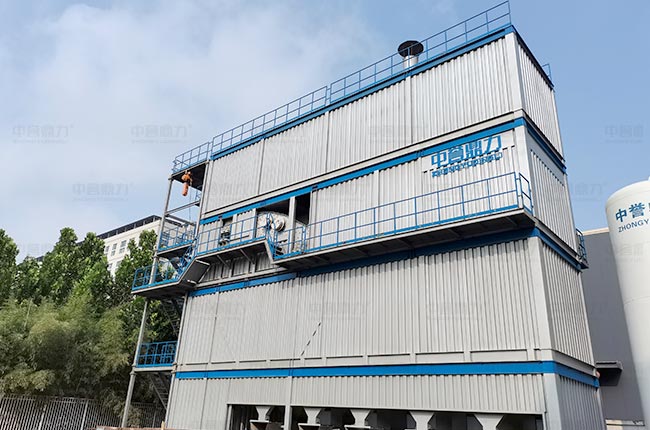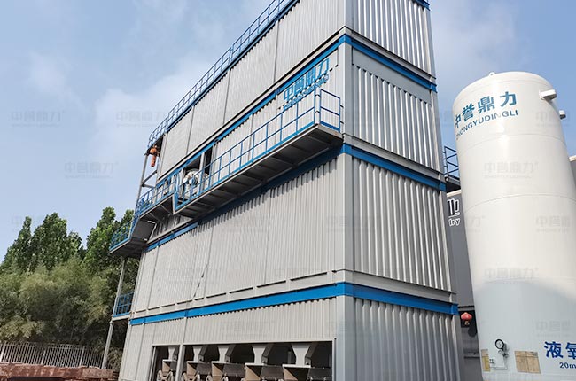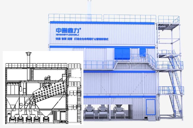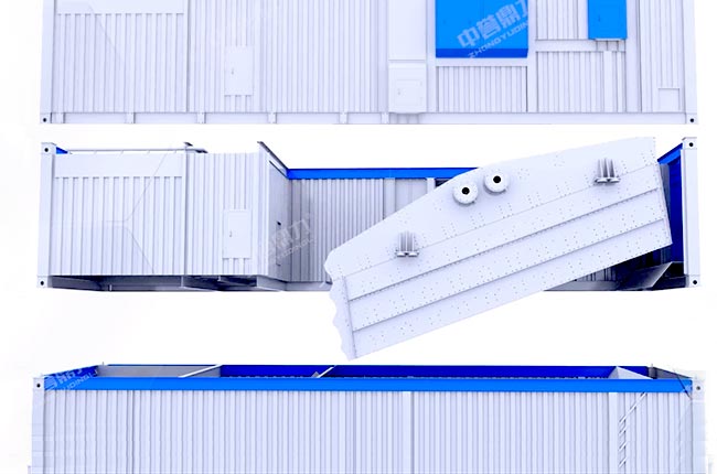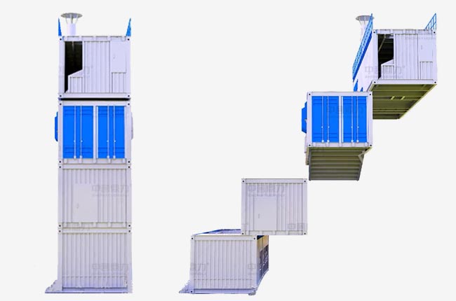 組裝式篩分樓分四層集裝箱設計,通過螺栓疊加連接,頂層模塊上部煙囪直通除塵器排風管;