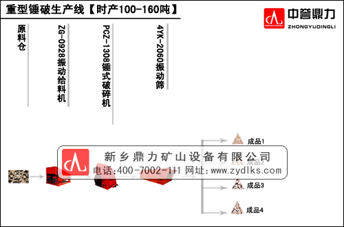 從山上爆破下來的石料,通過自卸車將600mm以下的石料送入振動給料機(jī),振動給料機(jī)把石料均勻的送入重錘式破碎機(jī),重錘破對石料進(jìn)行破碎,通過圓振動篩分級篩分后,粒度不合要求的大塊物料通過輸送帶回到重錘破進(jìn)行二段破碎,成品由皮帶機(jī)輸送至成品區(qū)。此石子生產(chǎn)線適合石灰石、青石、煤矸石、煤、礫石、片麻巖等抗壓強(qiáng)度不大于200Mpa的脆性物料,優(yōu)點(diǎn)是不需要如傳統(tǒng)的石子生產(chǎn)線一樣:鄂破+反擊破+圓錐破,只需要一臺重錘破就可以達(dá)到產(chǎn)量,破碎流程簡化,維護(hù)方便,節(jié)約生產(chǎn)成本。下面就100-160噸每小時的大產(chǎn)量石子生產(chǎn)線配置進(jìn)行詳解。