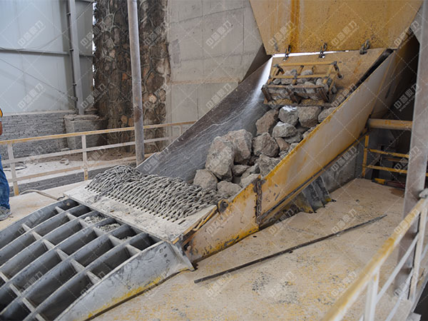 當(dāng)原料中土含量較少且原料較干燥時(shí),可將振動(dòng)給料機(jī)篩條間尺寸調(diào)至適當(dāng)數(shù)值,物料通過(guò)給料機(jī)后將土篩除即可;