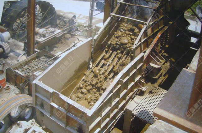 加工原料經(jīng)振動(dòng)送料機(jī)定期、定向?qū)⒓庸ぴ纤腿雙e鄂破機(jī)進(jìn)行粗碎,送料的此時(shí),預(yù)先篩選分級(jí)出加工原料中夾雜的異物,防止其進(jìn)入碎石機(jī)的機(jī)腔,毀壞機(jī)器,從pe鄂破機(jī)出來后,振動(dòng)篩篩選出破碎合格的部分送入二級(jí)破石機(jī)械(反擊礦山碎石機(jī)、圓錐碎石機(jī))進(jìn)行二段破碎,破碎至更小的顆粒,便于進(jìn)行制砂處置,石子打砂機(jī)對(duì)二段破碎合格的加工原料進(jìn)行沖擊制砂,根據(jù)成品要求,將性能調(diào)改至滿意數(shù)據(jù),生產(chǎn)出期望粒度的成品砂石,加工原料從石子打砂機(jī)出來,會(huì)攜帶有揚(yáng)塵,砂石洗選機(jī)械可以將包覆在砂石表面的揚(yáng)塵,和中間夾雜的異物清洗干凈,后獲得干凈的河道石成品砂石。