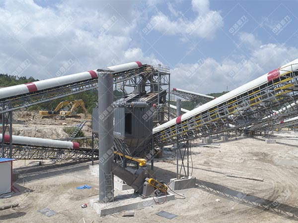 石頭由振動(dòng)送料機(jī)均勻地送入顎破進(jìn)行粗碎,粗碎后的石頭由皮帶運(yùn)輸機(jī)送入到破沙機(jī)進(jìn)行深度破碎,整型破碎后的石頭被運(yùn)輸?shù)胶Y機(jī)進(jìn)行篩選分級(jí),符合成品粒度要求的石頭被送入砂石洗選機(jī)械清洗,清洗后由成品皮帶運(yùn)輸機(jī)輸出即為成品;未符合成品粒度要求的石頭從篩機(jī)返回破沙機(jī)再次破碎,形成閉路多次循環(huán),成品粒度可按用戶的需要進(jìn)行組合和分級(jí),如果選擇干法加工技術(shù),可搭配粗細(xì)粉分離機(jī)和除塵機(jī)械,