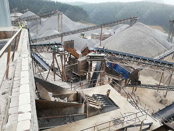 開采的石頭先由震動喂料機進料給顎破機進行粗破,在破碎至得當細度后經(jīng)由反擊整形石子機進行整形處置,之后由立軸沖擊石子機又一次進行破碎,再經(jīng)由篩分機篩選分級出成品,其成品的規(guī)格由碎石加工設備的型號以及篩分機的型號。