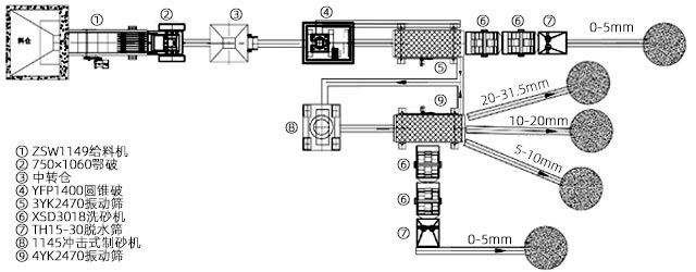 典型“鄂破+圓錐破+制砂機”三段制砂工藝,通過兩道工序篩分,配以洗砂設備實現(xiàn)水洗機制砂,以提高成品砂潔凈程度。
