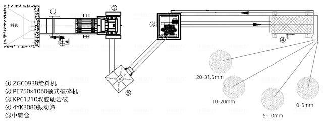 “鄂破+雙腔硬巖破”方案,成品花崗巖料粒型優(yōu)于圓錐破,同傳統(tǒng)圓錐破配置相比,對(duì)于粒型要求較高的,可節(jié)省整形設(shè)備的投資。