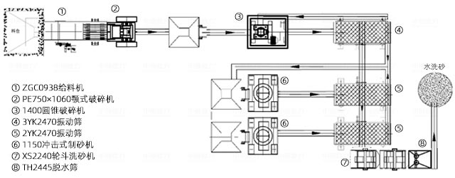 “鄂破+圓錐破+沖擊破”三段破碎方案,加上兩級(jí)篩分工藝,結(jié)合輪斗洗砂機(jī)、脫水篩設(shè)備對(duì)機(jī)制砂清洗作業(yè),實(shí)現(xiàn)高品質(zhì)機(jī)制砂生產(chǎn)。