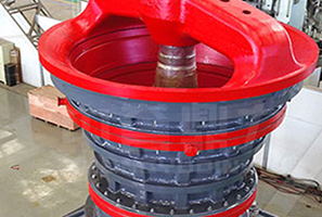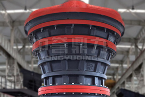 旋回式破碎機主要以機座、偏心套、轉(zhuǎn)動、破碎圓錐、中架體、橫梁、油缸等部件組成。