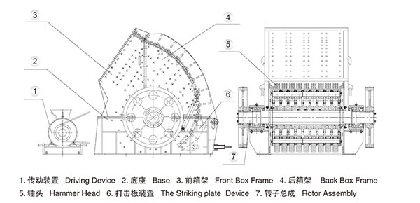 錘式礦山碎石機(jī)在工作時,電機(jī)驅(qū)動轉(zhuǎn)子在機(jī)腔內(nèi)高速操作,石頭自頂部送料口給入機(jī)內(nèi),受高速運(yùn)動的錘子的撞擊、沖擊、剪切、碾磨影響而粉碎,在轉(zhuǎn)子底部,裝有蓖條、粉碎石頭中小于篩網(wǎng)目數(shù)的粒級 通過蓖條排出,過篩網(wǎng)目數(shù)的粗粒級 阻留在蓖條上繼續(xù)獲得錘子的撞擊和碾磨, 再通過蓖條排出機(jī)外。