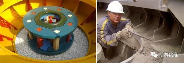 PCL為進料,VSI有完進料和進料伴隨環(huán)形瀑落進料兩種,VSI5X(第五代制砂機)采用的是散料盤裝置,可快速實現(xiàn)給料和瀑落給料的轉(zhuǎn)換,減少停機調(diào)整時間,提率。VSI4X(第四代制砂機)采用的是散料錐裝置,將散料錐卸掉可實現(xiàn)完進料。