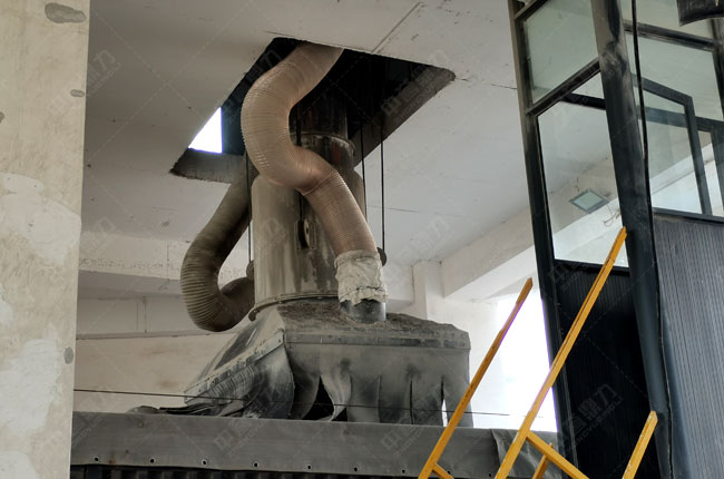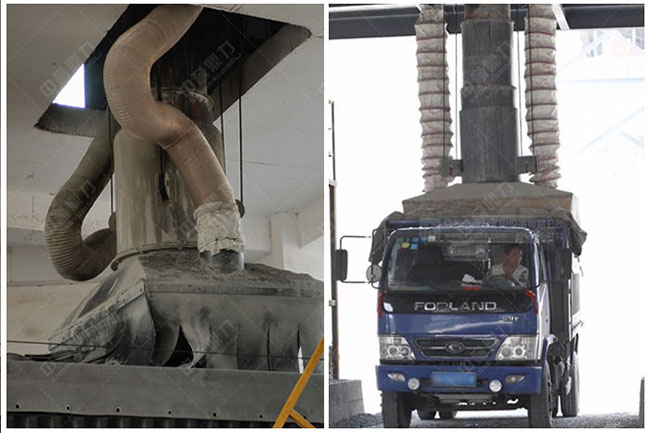 料倉自動(dòng)放料裝車系統(tǒng)配用了一種砂石料無塵裝車裝置,包括卸料斗、升降控制裝、卸料筒體等,環(huán)保環(huán)節(jié)包括吸塵管、收塵器、伸縮套管等,吸料管設(shè)置在卸料筒體兩側(cè),卸料口處有皮質(zhì)吸塵罩抑塵,利于吸料管收集卸料揚(yáng)塵。